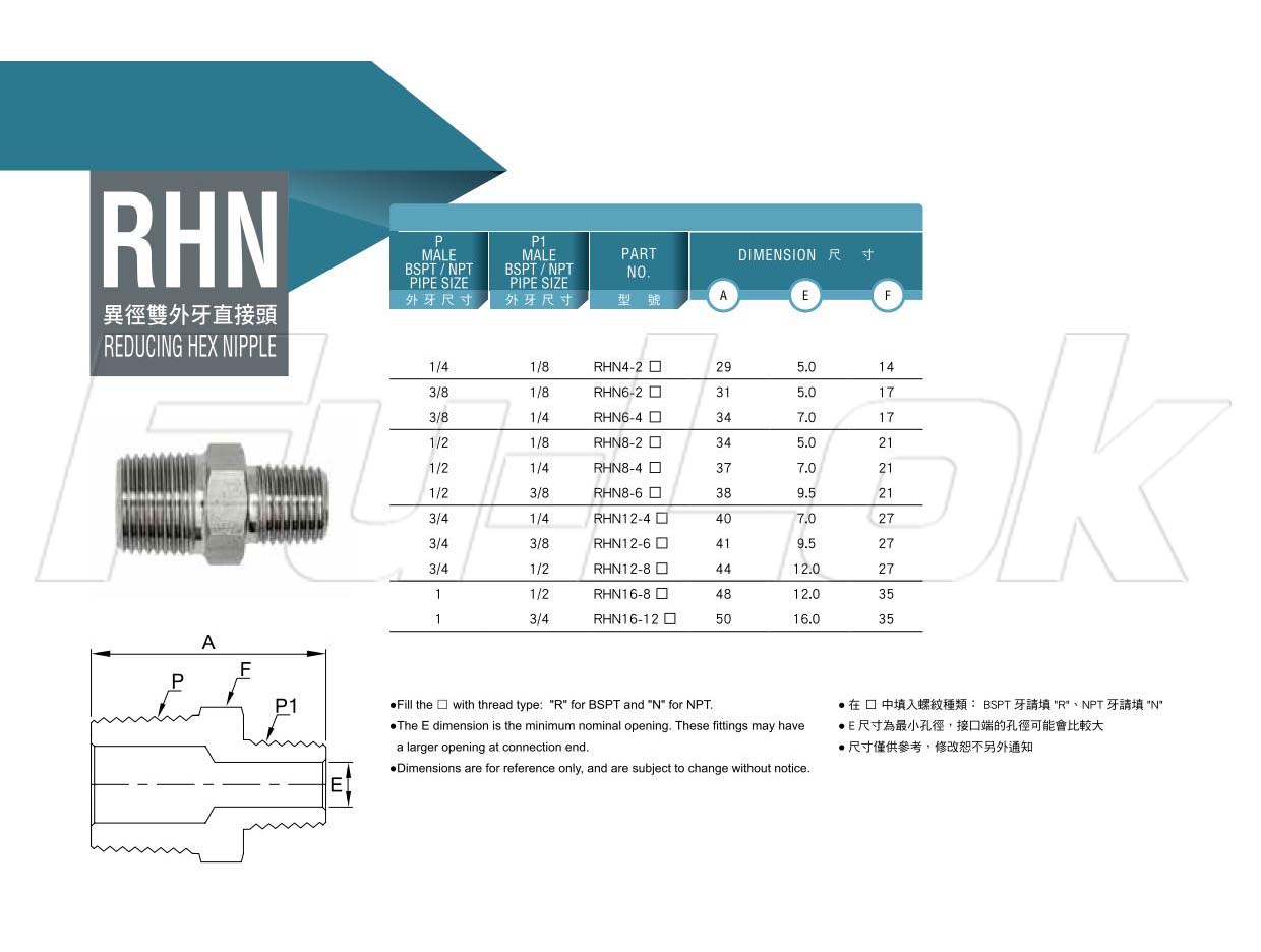 1.Thread Size: 1/8"~1"2.Thread Type: BSPT Thread(R)、NPT Thread(N)