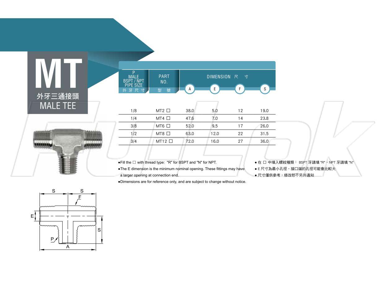 1.Thread Size: 1/8"~3/4"2.Thread Type: BSPT Thread(R)、NPT Thread(N)